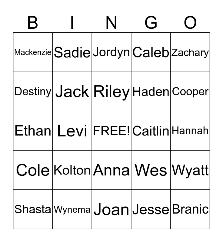 This bingo card has a free space and 24 words: Kolton, Wynema, Riley, Shasta, Zachary, Mackenzie, Destiny, Sadie, Caitlin, Anna, Haden, Ethan, Wes, Wyatt, Jack, Jesse, Hannah, Jordyn, Cooper, Levi, Branic, Cole, Caleb and Joan.