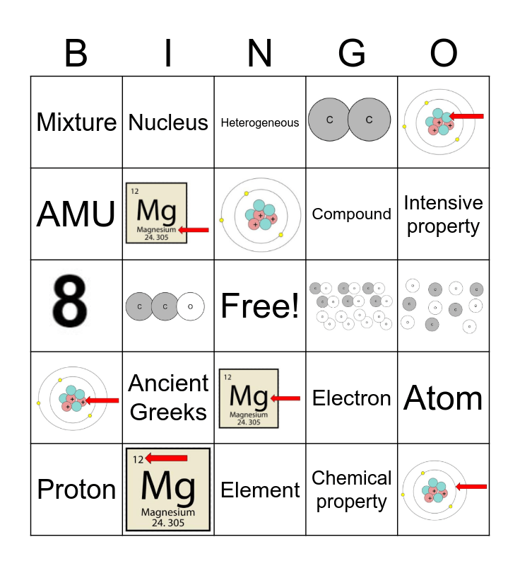 This bingo card has 15 images, a free space and 26 words: Ancient Greeks, Substance, Mixture, Homogeneous, Heterogeneous, Atom, Molecule, Element, Compound, Physical change, Physical property, Chemical property, Chemical change, Intensive property, Extensive property, Subatomic particles, Nucleus, Proton, Neutron, Electron, AMU, Atomic mass number, The periodic table, Bohr model, Valence electrons and 1 AMU.