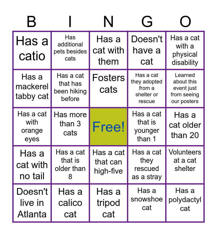 This bingo card has a free space and 29 words: Doesn't live in Atlanta, Doesn't live in Georgia, Has more than 3 cats, Has a black cat, Has a catio, Has a cat with them, Has a cat that has been hiking before, Has a cat that is older than 8, Has a cat that is younger than 1, Has a calico cat, Has a cat older than 20, Has a polydactyl cat, Has a tripod cat, Has a snowshoe cat, Learned about this event just from seeing our posters, Has a cat that can ride a skateboard, Has a cat that can high-five, Has a cat with no tail, Has a cat with a physical disability, Has a cat with orange eyes, Has a cat they rescued as a stray, Has a purebred cat, Has a cat they adopted from a shelter or rescue, Has a mackerel tabby cat, Doesn't have a cat, Has additional pets besides cats, Volunteers at a cat shelter, Fosters cats and Didn't have a cat as a child.