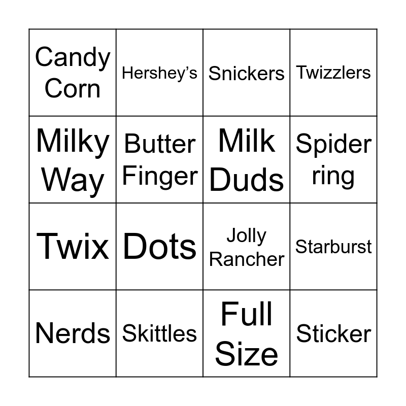 This bingo card has 16 words: Skittles, Starburst, Snickers, Candy Corn, Twix, Hershey’s, Jolly Rancher, Full Size, Milky Way, Butter Finger, Nerds, Twizzlers, Dots, Spider ring, Milk Duds and Sticker.
