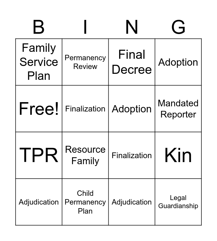 This bingo card has 16 words: Child Permanency Plan, Kin, Final Decree, Family Service Plan, TPR, Permanency Review, Finalization, Adjudication, Free!, Finalization, Adjudication, Adoption, Resource Family, Mandated Reporter, Adoption and Legal Guardianship.