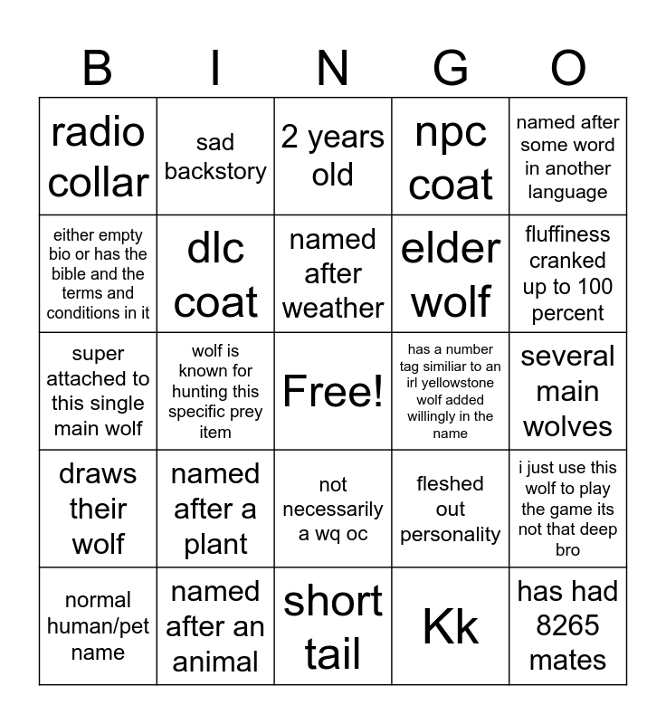 This bingo card has a free space and 24 words: named after a plant, named after an animal, named after weather, normal human/pet name, named after some word in another language, radio collar, either empty bio or has the bible and the terms and conditions in it, sad backstory, has a number tag similiar to an irl yellowstone wolf added willingly in the name, not necessarily a wq oc, elder wolf, super attached to this single main wolf, fleshed out personality, i just use this wolf to play the game its not that deep bro, dlc coat, Kk, several main wolves, 2 years old, fluffiness cranked up to 100 percent, wolf is known for hunting this specific prey item, has had 8265 mates, draws their wolf, npc coat and short tail.