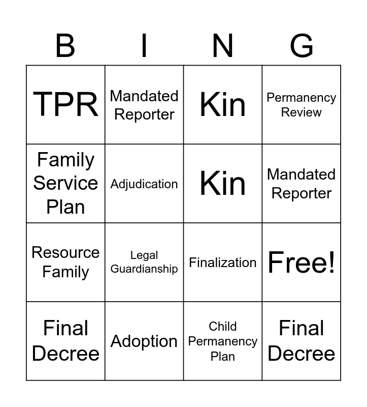 This bingo card has 16 words: Adoption, Free!, Kin, TPR, Resource Family, Mandated Reporter, Finalization, Child Permanency Plan, Family Service Plan, Adjudication, Final Decree, Permanency Review, Legal Guardianship, Mandated Reporter, Kin and Final Decree.