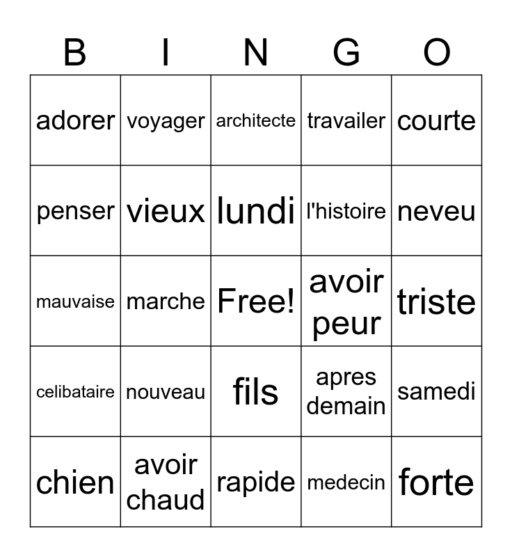 This bingo card has a free space and 29 words: chien, pourquoi, marche, manger, adorer, architecte, vieux, nouveau, avoir peur, avoir chaud, triste, forte, rapide, medecin, neveu, femme, fils, celibataire, courte, mauvaise, apres demain, aujourd'hui, l'histoire, penser, travailer, voyager, samedi, lundi and difficlie.
