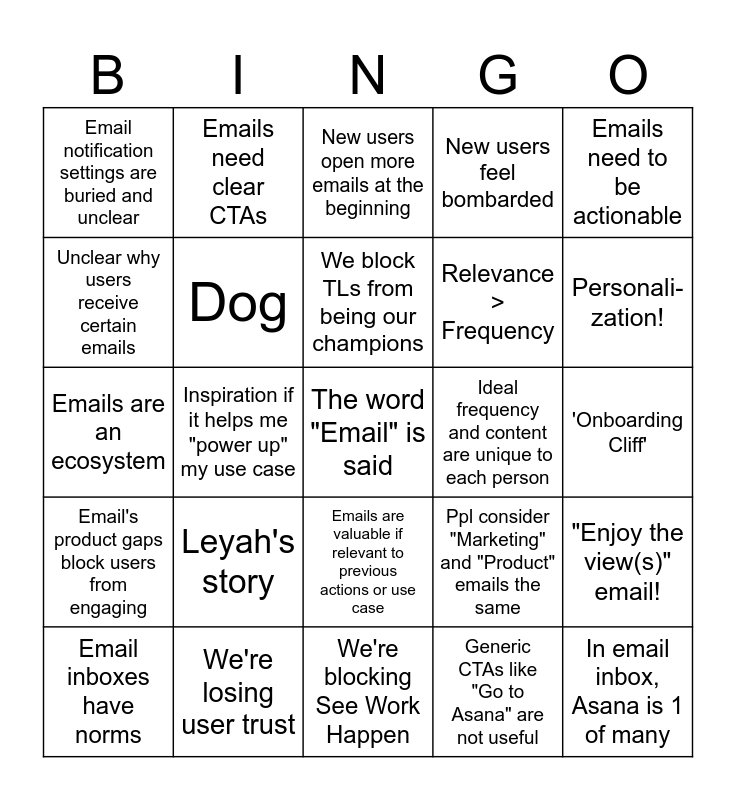This bingo card has a free space and 24 words: Leyah's story, We're losing user trust, We block TLs from being our champions, Email inboxes have norms, Emails need to be actionable, Email notification settings are buried and unclear, Unclear why users receive certain emails, Emails need clear CTAs, Ideal frequency and content are unique to each person, Emails are valuable if relevant to previous actions or use case, Relevance > Frequency, Emails are an ecosystem, Ppl consider "Marketing" and "Product" emails the same, "Enjoy the view(s)" email!, Dog, Generic CTAs like "Go to Asana" are not useful, 'Onboarding Cliff', New users open more emails at the beginning, Personali-zation!, Inspiration if it helps me "power up" my use case, In email inbox, Asana is 1 of many, Email's product gaps block users from engaging, New users feel bombarded and We're blocking See Work Happen.