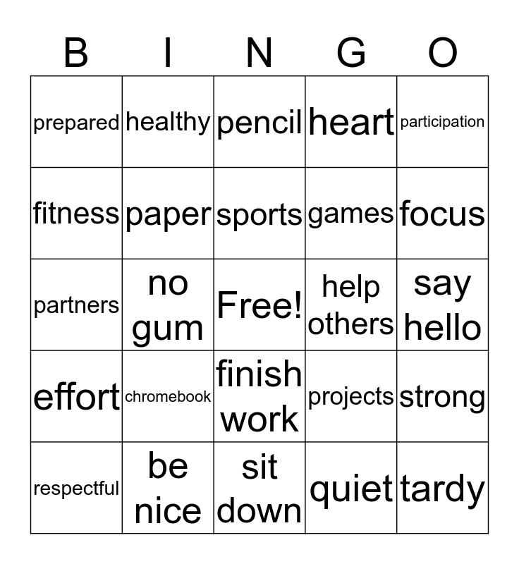 This bingo card has a free space and 29 words: respectful, listen, no gum, no food, prepared, pencil, paper, chromebook, help others, be nice, say hello, tardy, sit down, quiet, focus, no putdowns, finish work, effort, participation, partners, projects, fun, games, fitness, heart, healthy, strong, sports and life.