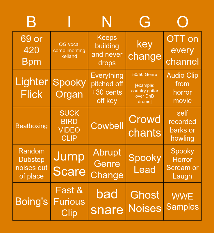 This bingo card has a free space and 24 words: Jump Scare, Fast & Furious Clip, Everything pitched off +30 cents off key, Boing's, OTT on every channel, 69 or 420 Bpm, Lighter Flick, OG vocal complimenting kelland, Crowd chants, Abrupt Genre Change, 50/50 Genre [example: country guitar over DnB drums], Beatboxing, Spooky Lead, Spooky Horror Scream or Laugh, Spooky Organ, Ghost Noises, self recorded barks or howling, Keeps building and never drops, Audio Clip from horror movie, SUCK BIRD VIDEO CLIP, WWE Samples, Random Dubstep noises out of place, key change and bad snare.