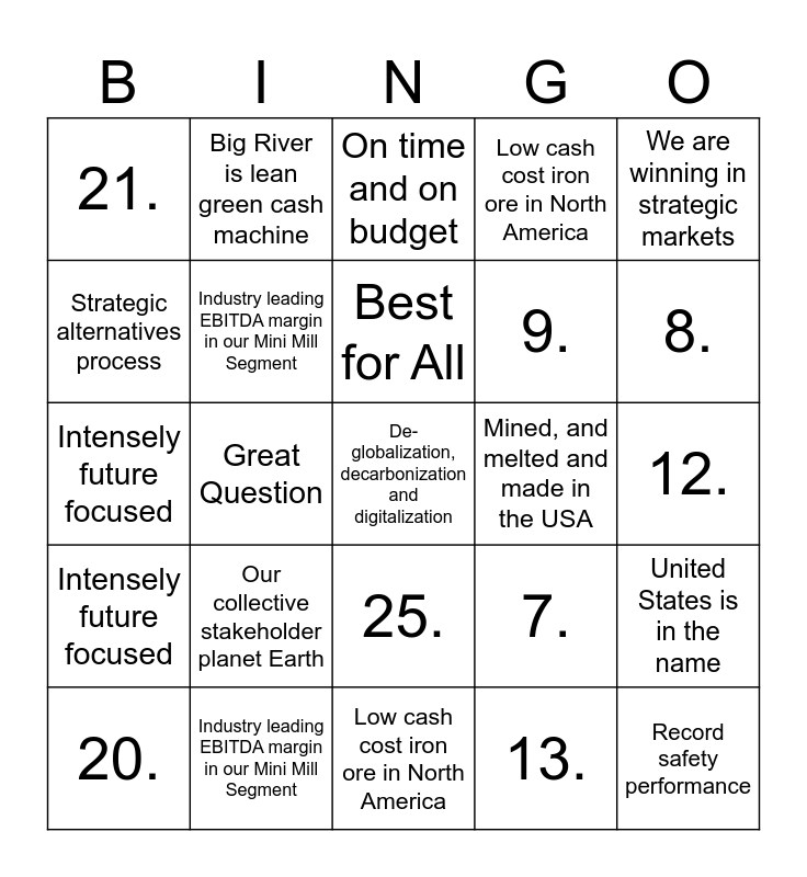 This bingo card has 77 words: The future has never been brighter, AI, On time and on budget, The value we are creating has been recognized, Maximize value for our stockholders, Customer-centric, World competitive, Strong as steel balance sheet, Less cost, less capital and less Carbon Intensive Business Model, Move down the cost curve and move up the talent curve, Our collective stakeholder planet Earth, Record safety performance, in-flight initiatives, Best for All, Strategic alternatives process, I am bullish on US Steel, Great Question, Mined, and melted and made in the USA, De-globalization, decarbonization and digitalization, Multiple offers on multiple fronts, We are winning in strategic markets, United States is in the name, Intensely future focused, Industry leading EBITDA margin in our Mini Mill Segment, Big River is lean green cash machine, Low cash cost iron ore in North America, The future has never been brighter, We've earned additional market share with auto OEMs, 1., 2., 3., 4., 5., 6., 7., 8., 9., 10., 11., 12., 13., 14., 15., 16., 17., 18., 19., 20., 21., 22., 23., 24., 25., Best for All, On time and on budget, Maximize value for our stockholders, Customer-centric, eorld competitive, Strategic alternatives process, Strong as steel balance sheet, Less cost, less capital and less carbon intensive business model, Move down the cost curve and move up the talent curve, Our collective stakeholder planet Earth, Record safety performance, In-flight initiatives, AI, The value we are creating has been recognized, I am bullish on US Steel, Great Question, Mined, and melted and made in the USA, De-globalization, decarbonization and digitalization, Multiple offers on multiple fronts, We are winning in strategic markets, United States is in the name, Intensely future focused, Industry leading EBITDA margin in our Mini Mill Segment, Big River is lean green cash machine, Low cash cost iron ore in North America and We've earned additional market share with auto OEMs.