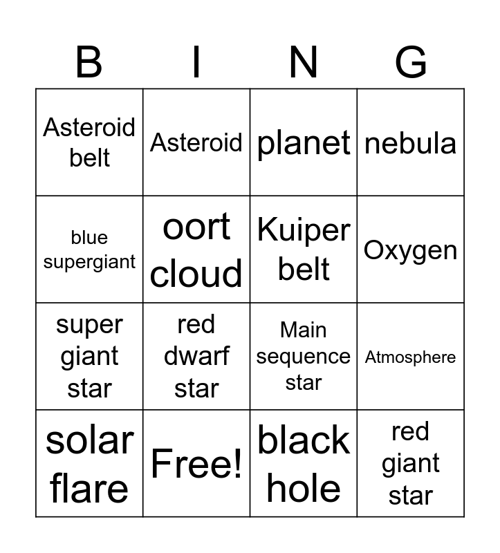 This bingo card has 22 words: Free!, Comet, Asteroid, Orbit, oort cloud, Kuiper belt, Asteroid belt, planet, Main sequence star, red giant star, super giant star, nebula, white dwarf, neutron star, black hole, Electromagnetic spectrum, Atmosphere, solar flare, red dwarf star, blue supergiant, Oxygen and habitable zone.