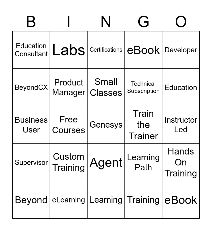 This bingo card has a free space and 29 words: Beyond, Agent Platform, Free Courses, Instructor, Education Consultant, Certifications, Product Manager, Custom Training, Train the Trainer, eLearning, Instructor Led, eBook, Learning, Training, Education, System Administrator, Agent, Supervisor, Developer, Business User, Learning Path, Partners, Technical Subscription, BeyondCX, eBook, Labs, Hands On Training, Small Classes and On Your Time Learning.