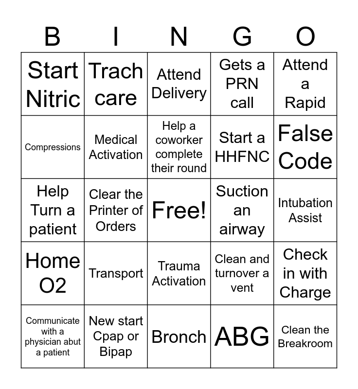 This bingo card has a free space and 24 words: Transport, New start Cpap or Bipap, Help a coworker complete their round, Communicate with a physician abut a patient, Attend a Rapid, Start Nitric, Compressions, Trach care, Suction an airway, Trauma Activation, Start a HHFNC, Help Turn a patient, Clean and turnover a vent, Check in with Charge, Medical Activation, ABG, Intubation Assist, Attend Delivery, False Code, Clear the Printer of Orders, Clean the Breakroom, Home O2, Gets a PRN call and Bronch.
