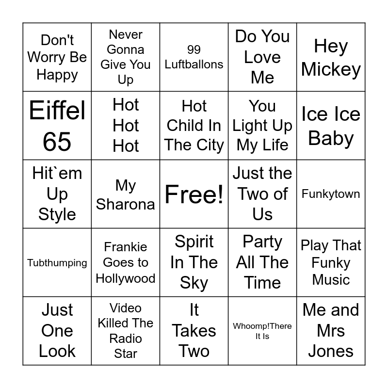 This bingo card has a free space and 81 words: 867-5305 Jenny, 96 Tears, 99 Luftballons, Achy Breaky Heart, Afternoon Delight, Barbie Girl, Cars, Closing Time, Come On Eileen, Convoy, Copperhead Road, Da Dip, Do You Love Me, Don't Worry Be Happy, Easy Lover, Eiffel 65, Electric Avenue, Frankie Goes to Hollywood, Friday, Funkytown, Hey Baby, Hey Mickey, Hit`em Up Style, Hot Child In The City, Hot Hot Hot, I Believe In A Thing Called Love, I Touch Myself, I Try, I Want Candy, I'm Gonna Be 500 Miles, Ice Ice Baby, I'm Too Sexy, It Takes Two, Jump, Just One Look, Just the Two of Us, Kung Fu Fighting, La Bamaba, Macarena, Mabo # 5, Me and Mrs Jones, MMMBop, Monster Mash, Mr.Big Stuff, My Sharona, Na Na Hey Hey Kiss Him Goodbye, Never Gonna Give You Up, No Rain, Nothing Compares 2 U, OOH Child, Party All The Time, Play That Funky Music, Rapper's Delight, Rico Suave, Rockin'Robin, Safety Dance, Sail, Seasons In The Sun, Smokin in the Boys Room, Somebody That I Used To Know, Spirit In The Sky, Stacy's Mom, Steal My Sunshine, Sugar, Sugar, Supersonic, Tainted Love, Take On Me, The Boys Are Back In Town, The Lion Sleeps Tonight, The Night The Lights Went Out In Georgia, True, Tubthumping, Video Killed The Radio Star, We're Not Gonna Take It, What is Love, Whip It, Who Let the Dogs Out, Whoomp!There It Is, Wipe Out, You Light Up My Life and You Sexy Thing.