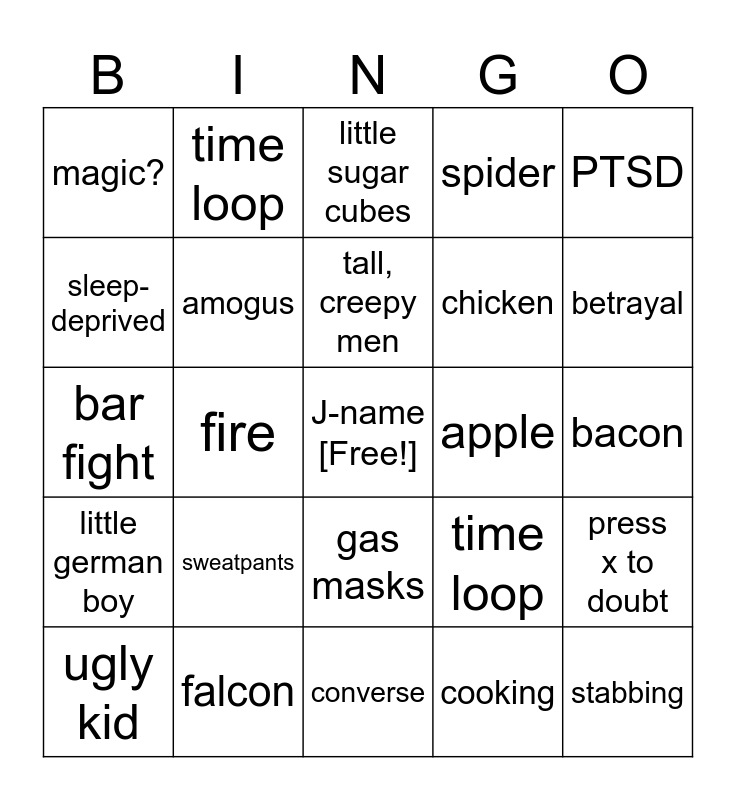 This bingo card has a free space and 24 words: sweatpants, falcon, tall, creepy men, ugly kid, PTSD, magic?, sleep-deprived, time loop, apple, gas masks, chicken, bar fight, time loop, press x to doubt, amogus, cooking, bacon, little sugar cubes, betrayal, fire, stabbing, little german boy, spider and converse.
