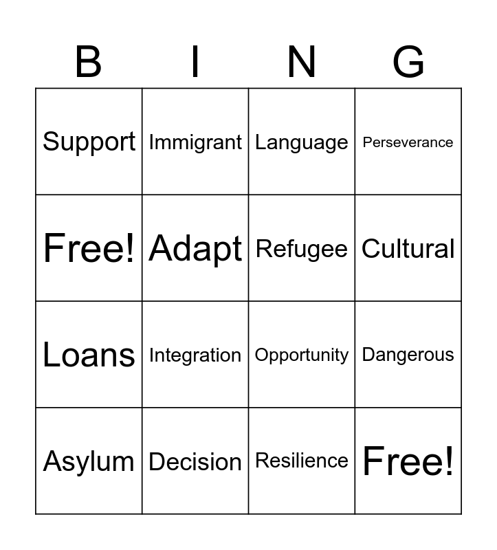 This bingo card has 16 words: Decision, Dangerous, Language, Support, Loans, Immigrant, Opportunity, Resilience, Free!, Adapt, Asylum, Perseverance, Integration, Cultural, Refugee and Free!.