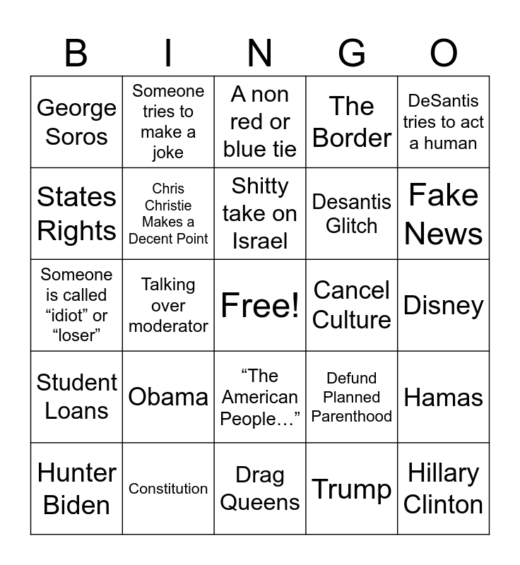 This bingo card has a free space and 56 words: January 6, Hunter Biden, “Our ally, Israel”, George Soros, Drag Queens, Critical Race Theory, Chris Christie Makes a Decent Point, Parental Rights, Desantis Glitch, Abortion/Roe v. Wade, The Border, Mexico, China, Ukraine, Putin, Woke, DeSantis tries to act a human, Talking over moderator, Radical Left, Hillary Clinton, Cancel Culture, Canidates talk over one another, Defund Planned Parenthood, A non red or blue tie, Climate change denial, Shitty take on Israel, The Middle Class, Voter Fraud, Fake News, Gd, Supreme Court, The Wall, COVID, Taxes, Disney, States Rights, Someone is called “idiot” or “loser”, Iran, Student Loans, Someone tries to make a joke, “The American People…”, Unemployment, Wife, Ronald Regan, Fauci, Obama, Constitution, Jack Smith, Biden, Kamala Harris, Trump, Obama Care, Jobs, DOJ, Hamas and Netanyahu.