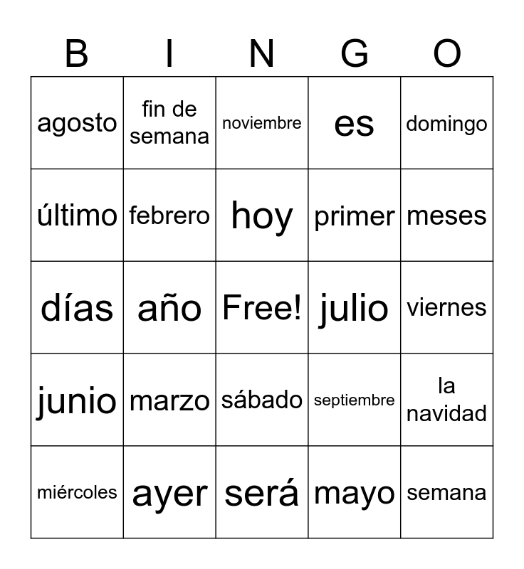 This bingo card has a free space and 34 words: lunes, mayo, diciembre, martes, junio, febrero, domingo, miércoles, fin de semana, jueves, hoy, noviembre, octubre, enero, julio, meses, ayer, días, marzo, septiembre, sábado, abril, agosto, viernes, será, semana, es, fue, primer, último, pasado, año, la navidad and año nuevo.
