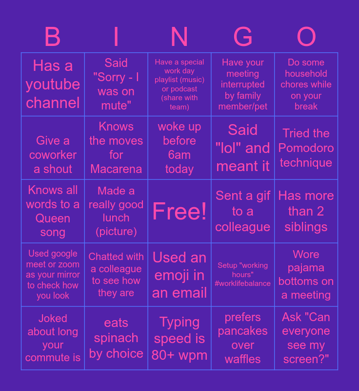 This bingo card has a free space and 27 words: Said "Can you hear me?", eats spinach by choice, woke up before 6am today, prefers pancakes over waffles, Do some household chores while on your break, Give a coworker a shout, Said "Sorry - I was on mute", Typing speed is 80+ wpm, Sent a gif to a colleague, Wore pajama bottoms on a meeting, Used google meet or zoom as your mirror to check how you look, Knows the moves for Macarena, Setup "working hours" #worklifebalance, Ask "Can everyone see my screen?", Knows all words to a Queen song, Made a really good breakfast (picture), Have a special work day playlist (music) or podcast (share with team), Have your meeting interrupted by family member/pet, Has more than 2 siblings, Has a youtube channel, Chatted with a colleague to see how they are, Used an emoji in an email, Said "lol" and meant it, Tried the Pomodoro technique, Joked about long your commute is, Made a really good lunch (picture) and Forgot to brush your teeth this morning.