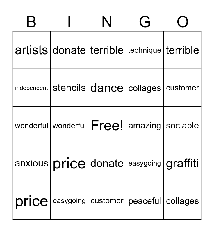 ⚠ This card has duplicate items: artists (2), collages (2), mural (2), customer (2), price (2), shopping center (2), donate (2), anxious (2), independent (2), creative (2), stencils (2), technique (2), graffiti (2), easygoing (2), sociable (2), patient (2), dance (2), amazing (2), incredible (2), terrible (2), wonderful (2), peaceful (2)