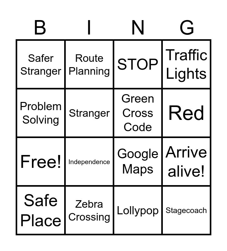 This bingo card has 26 words: Free!, Confidence, Independence, Green, Red, Safer Stranger, Stranger, STOP, Bus, Safe Place, Zebra Crossing, Green Cross Code, Communication, Timetables, Bus driver, Bus pass, Traffic Lights, Problem Solving, Route Planning, Google Maps, Stagecoach, Mobile Phone, Personal Safety, Lollypop, Arrive alive! and Be bright, be seen!.