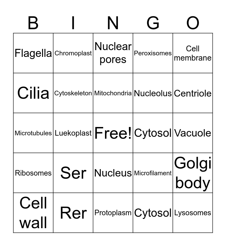 This bingo card has a free space and 24 words: Ser, Rer, Mitochondria, Cell wall, Cell membrane, Flagella, Cilia, Chromoplast, Cytosol, Nucleus, Nucleolus, Microtubules, Microfilament, Golgi body, Cytoskeleton, Cytosol, Vacuole, Nuclear pores, Centriole, Luekoplast, Lysosomes, Ribosomes, Peroxisomes and Protoplasm.