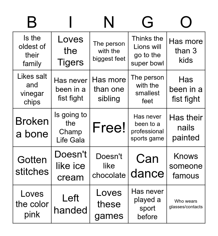 This bingo card has a free space and 24 words: Doesn't like ice cream, Left handed, Has more than one sibling, Loves the color pink, Has more than 3 kids, Is the oldest of their family, Likes salt and vinegar chips, Loves the Tigers, Has never been to a professional sports game, Doesn't like chocolate, The person with the smallest feet, Broken a bone, Can dance, Knows someone famous, Has never been in a fist fight, Has never played a sport before, Has their nails painted, The person with the biggest feet, Has been in a fist fight, Is going to the Champ Life Gala, Who wears glasses/contacts, Gotten stitches, Thinks the Lions will go to the super bowl and Loves these games.