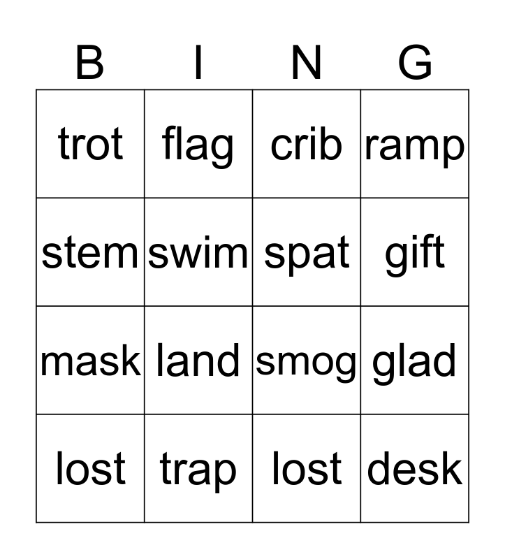 This bingo card has 16 words: trap, glad, crib, trot, mask, flag, smog, lost, stem, swim, lost, ramp, land, gift, spat and desk.