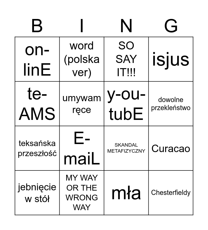 This bingo card has 16 words: MY WAY OR THE WRONG WAY, Curacao, SO SAY IT!!!, on-linE, teksańska przeszłość, word (polska ver), SKANDAL METAFIZYCZNY, mła, te-AMS, umywam ręce, jebnięcie w stół, isjus, E-maiL, dowolne przekleństwo, y-ou-tubE and Chesterfieldy.