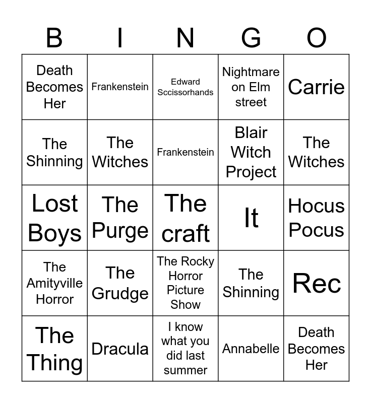 ⚠ This card has duplicate items: Nightmare Before Christmas (2), Hocus Pocus (2), Coraline (2), The Addams Family (2), Beetlejuice (2), Ghostbusters (2), Halloween (2), Scream (2), Friday the 13th (2), Nightmare on Elm street (2), Poltergeist (2), Zombieland (2), Dracula (2), Candyman (2), Arachnophobia (2), Blair Witch Project (2), Interview with a Vampire (2), The Conjuring (2), Insidious (2), The Ring (2), The Grudge (2), Paranormal Activity (2), Sleepy Hollow (2), The Exorcist (2), It (2), Carrie (2), The Shinning (2), Psycho (2), Night of the Living Dead (2), The Purge (2), Death Becomes Her (2), The Others (2), The Rocky Horror Picture Show (2), Annabelle (2), Frankenstein (2), Rec (2), Dark Shadows (2), Corpse Bride (2), The Amityville Horror (2), What We Do in the Shadows (2), Nosferatu (2), Lost Boys (2), The Thing (2), The Witches (2), Edward Sccissorhands (2), Casper (2), Halloweentown (2), Fright Night (2), I know what you did last summer (2)