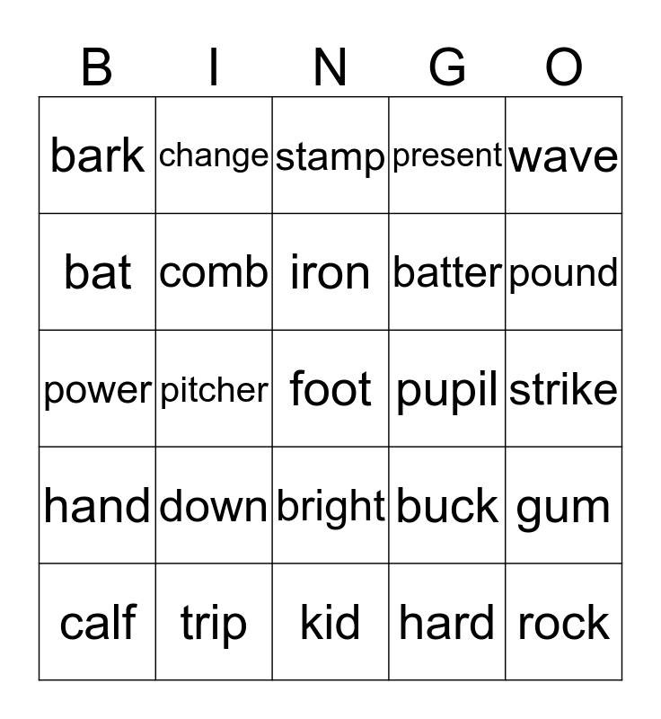This bingo card has 25 words: down, kid, iron, calf, wave, bark, bat, change, pupil, bright, batter, power, buck, gum, comb, rock, strike, stamp, pound, pitcher, foot, trip, hand, present and hard.
