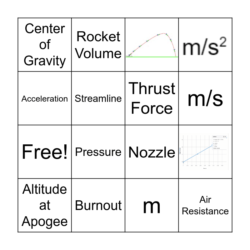 This bingo card has 4 images and 16 words: Water Volume, Altitude at Apogee, Acceleration, Burnout, Center of Gravity, Free!, Rocket Volume, Pressure, Nozzle, Streamline, Air Resistance, Thrust Force, Research, m/s, m and sec.