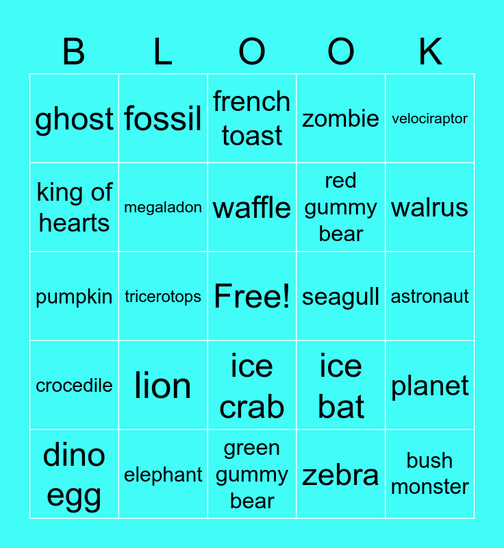 This bingo card has a free space and 34 words: black beard, zebra, pirate pufferfish, blue gummy bear, crocedile, megaladon, velociraptor, dino egg, fossil, yeti, waffle, french toast, cheshire, cat, seagull, walrus, elephant, pumpkin, lion, ice bat, ice crab, sloth, ghost, astronaut, green gummy bear, bush monster, zombie, ice bug, red gummy bear, king of hearts, UFO, tricerotops, planet and mad hatter.