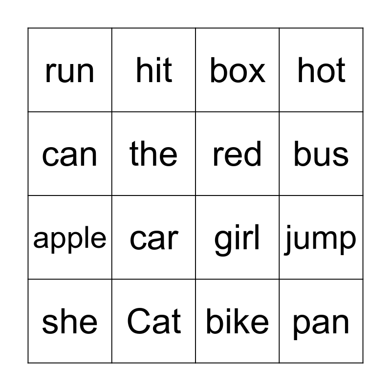 This bingo card has 16 words: Cat, jump, box, run, apple, hit, girl, bike, can, the, she, hot, car, bus, red and pan.