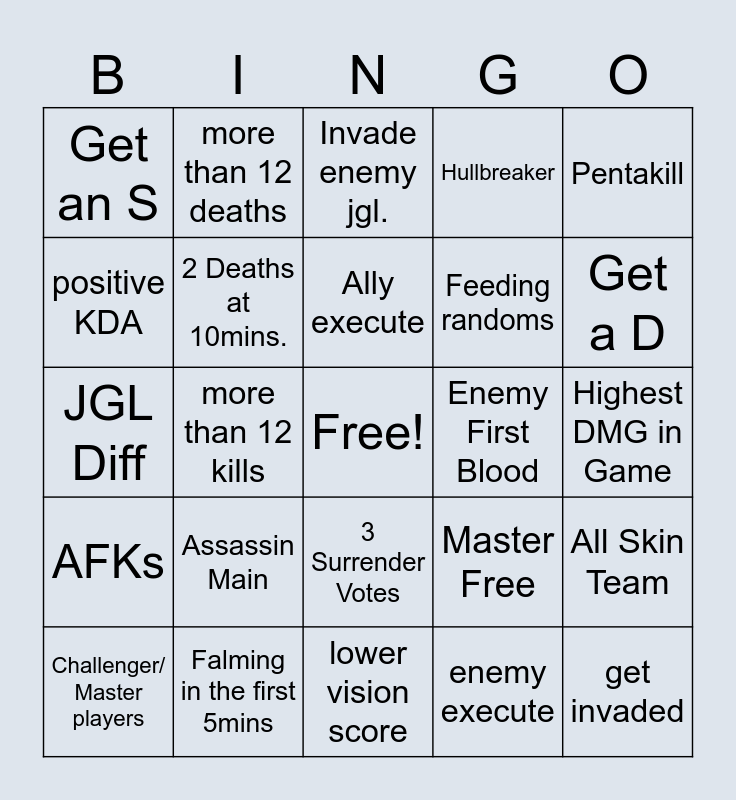 This bingo card has a free space and 24 words: Assassin Main, Falming in the first 5mins, Ally execute, Challenger/ Master players, Pentakill, Get an S, positive KDA, more than 12 deaths, Enemy First Blood, 3 Surrender Votes, Feeding randoms, JGL Diff, Master Free, All Skin Team, 2 Deaths at 10mins., enemy execute, Highest DMG in Game, Invade enemy jgl., Get a D, more than 12 kills, get invaded, AFKs, Hullbreaker and lower vision score.