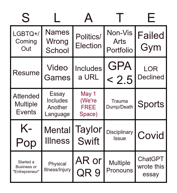 This bingo card has a free space and 29 words: Started a Business or "Entrepreneur", Famous Quote, Essay Includes Another Language, Influencer/ Content Creator, LGBTQ+/ Coming Out, Politics/ Election, Video Games, Mental Illness, Trauma Dump/Death, Physical Illness/Injury, Sports, ChatGPT wrote this essay, AR or QR 9, Multiple Pronouns, LOR Declined, LOR 3+ Pages, Taylor Swift, K-Pop, Failed Gym, Attended Multiple Events, Disciplinary Issue, SAT < 1100, GPA < 2.5, Resume, Non-Vis Arts Portfolio, Names Wrong School, Covid, Includes a URL and Fanfic Author.