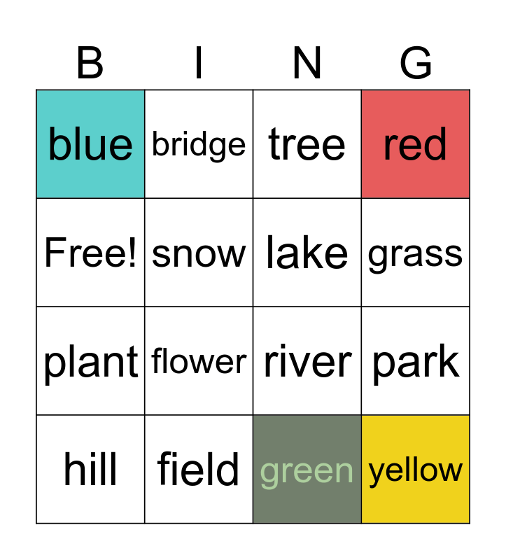 This bingo card has 16 words: field, park, tree, blue, plant, bridge, river, green, Free!, snow, hill, red, flower, grass, lake and yellow.