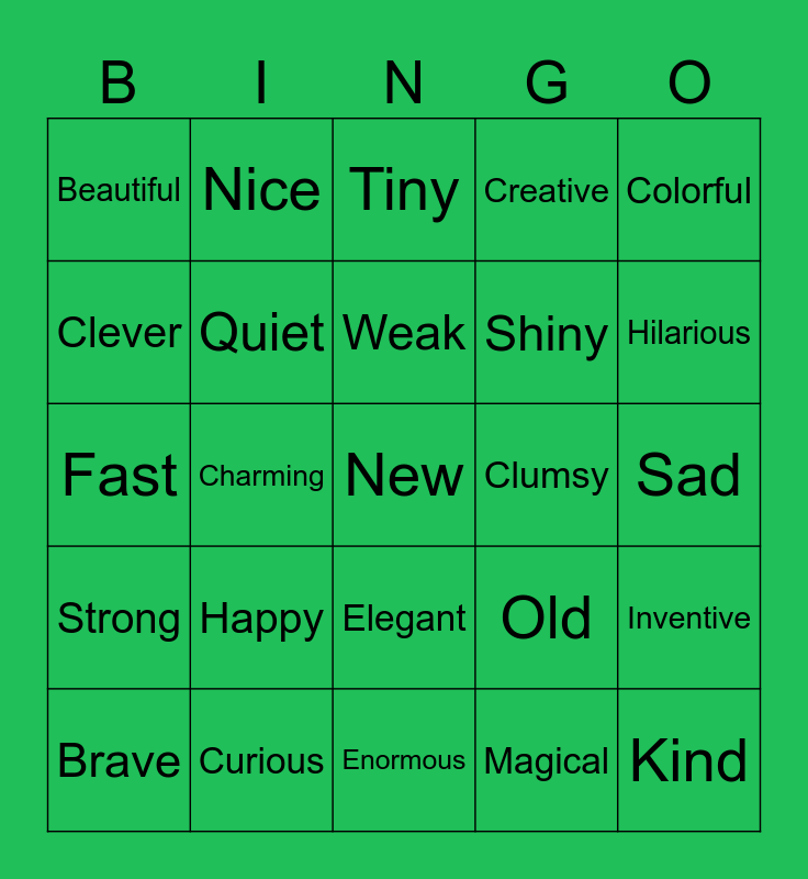 This bingo card has 25 words: Happy, Enormous, Weak, Brave, Colorful, Beautiful, Clever, Nice, Clumsy, Elegant, Shiny, Fast, Old, Inventive, Quiet, Kind, Sad, Tiny, Hilarious, Charming, New, Curious, Strong, Creative and Magical.