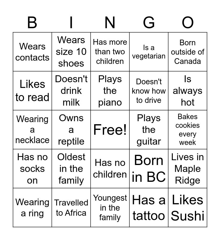 This bingo card has a free space and 50 words: Born in January, Likes Sushi, This is their first retreat, Youngest in the family, Oldest in the family, Less than 5 feet tall, Wears size 10 shoes, Owns a horse, Likes to read, Likes to garden, Doesn't drink milk, Is a vegetarian, Lives in Maple Ridge, Born in BC, Not born in BC, Owns a dog, Plays the piano, Plays the guitar, Born in the summer, Born outside of Canada, Owns a reptile, Has a tattoo, Wears contacts, Doesn't know how to drive, Is wearing silly socks, Is always cold, Is always hot, Is not married, Has more than two children, Has no children, Lives alone, Owns a tent, Owns a trailer, Likes to camp, Travelled to Africa, Has never been outside of Canada, Has been to Disneyland this year, Has never been to Disneyland, Likes to cook, Bakes cookies every week, Dislikes chocolate, Is retired, Is a student, Has a PhD, Wearing a ring, Wearing a necklace, Has more than two piercings, Has no piercings, Has no socks on and Doesn't drink coffee.