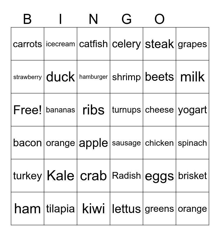This bingo card has 36 words: Radish, crab, lettus, strawberry, bacon, turnups, duck, kiwi, steak, eggs, milk, celery, brisket, bananas, shrimp, carrots, turkey, cheese, Free!, catfish, ribs, orange, sausage, apple, chicken, icecream, beets, tilapia, hamburger, grapes, orange, ham, spinach, yogart, Kale and greens.