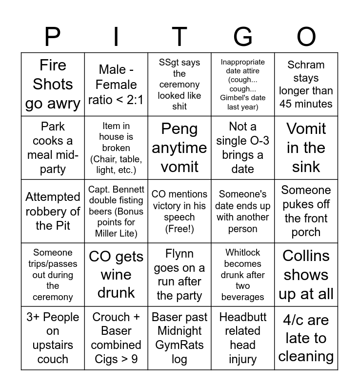 This bingo card has a free space and 24 words: CO gets wine drunk, Crouch + Baser combined Cigs > 9, Peng anytime vomit, 3+ People on upstairs couch, Schram stays longer than 45 minutes, Fire Shots go awry, Park cooks a meal mid-party, Male - Female ratio < 2:1, Someone's date ends up with another person, Flynn goes on a run after the party, Not a single O-3 brings a date, Attempted robbery of the Pit, Whitlock becomes drunk after two beverages, Collins shows up at all, Item in house is broken (Chair, table, light, etc.), Headbutt related head injury, Someone pukes off the front porch, SSgt says the ceremony looked like shit, Vomit in the sink, Capt. Bennett double fisting beers (Bonus points for Miller Lite), 4/c are late to cleaning, Someone trips/passes out during the ceremony, Inappropriate date attire (cough... cough... Gimbel's date last year) and Baser past Midnight GymRats log.