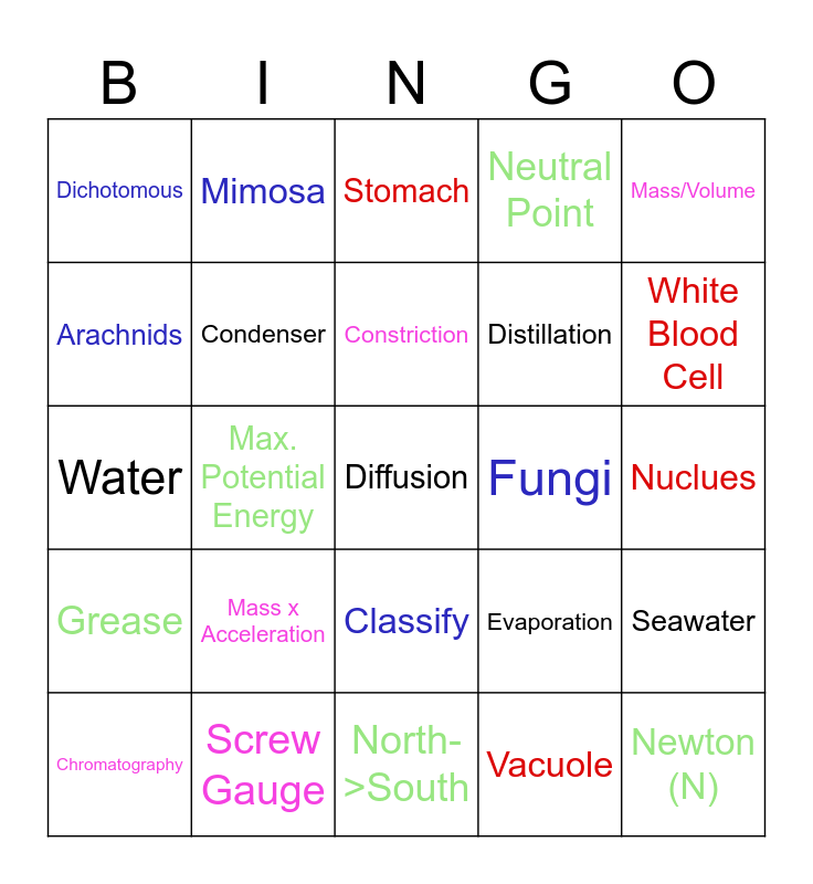This bingo card has a free space and 24 words: Mass x Acceleration, Screw Gauge, Constriction, Chromatography, Mass/Volume, Dichotomous, Arachnids, Mimosa, Fungi, Classify, Distillation, Water, Evaporation, Seawater, Condenser, Vacuole, Nuclues, Stomach, White Blood Cell, Max. Potential Energy, Newton (N), Grease, Neutral Point and North->South.