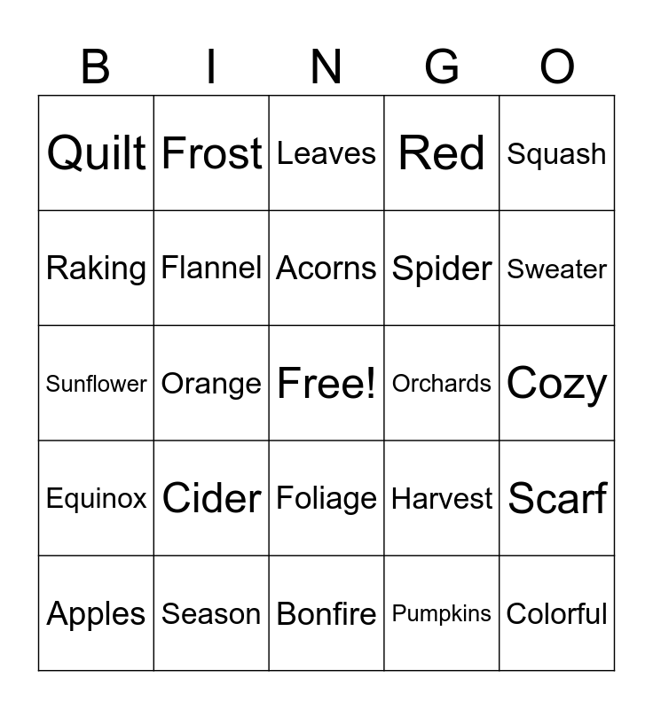 This bingo card has a free space and 35 words: Scare-crow, Hayride, Birds, Flannel, Foliage, Red, Raking, Jacket, Acorns, Yellow, Sunflower, Squash, Trees, Foggy, Quilt, Orchards, Pumpkins, Orange, Equinox, Colorful, Harvest, Apples, Scarf, Season, Leaves, Sweater, Honking Geese, Wheel-barrow, Spider, Cozy, Chilly, Bonfire, Cider, Frost and Splendor.