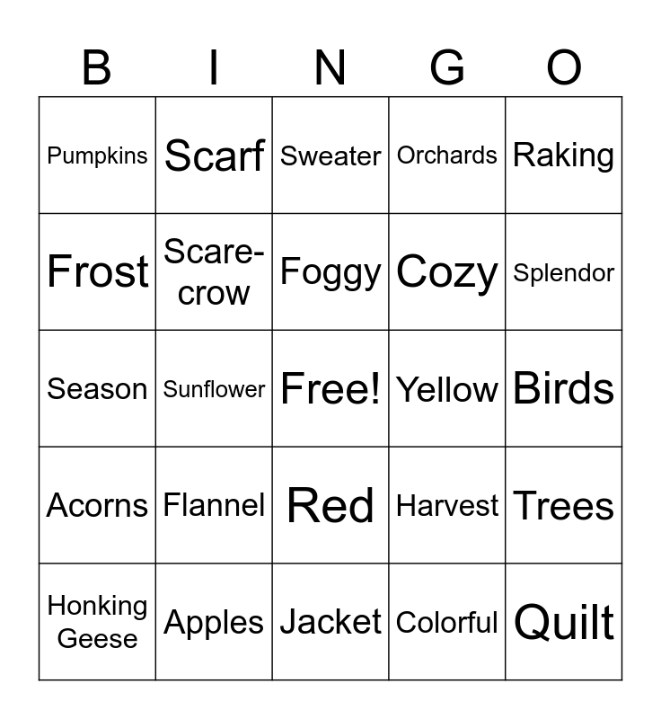 This bingo card has a free space and 35 words: Spider, Leaves, Chilly, Scare-crow, Red, Orchards, Frost, Hayride, Foggy, Bonfire, Season, Raking, Equinox, Wheel-barrow, Pumpkins, Yellow, Colorful, Sunflower, Acorns, Quilt, Harvest, Honking Geese, Trees, Apples, Sweater, Splendor, Foliage, Orange, Cozy, Birds, Squash, Jacket, Flannel, Scarf and Cider.