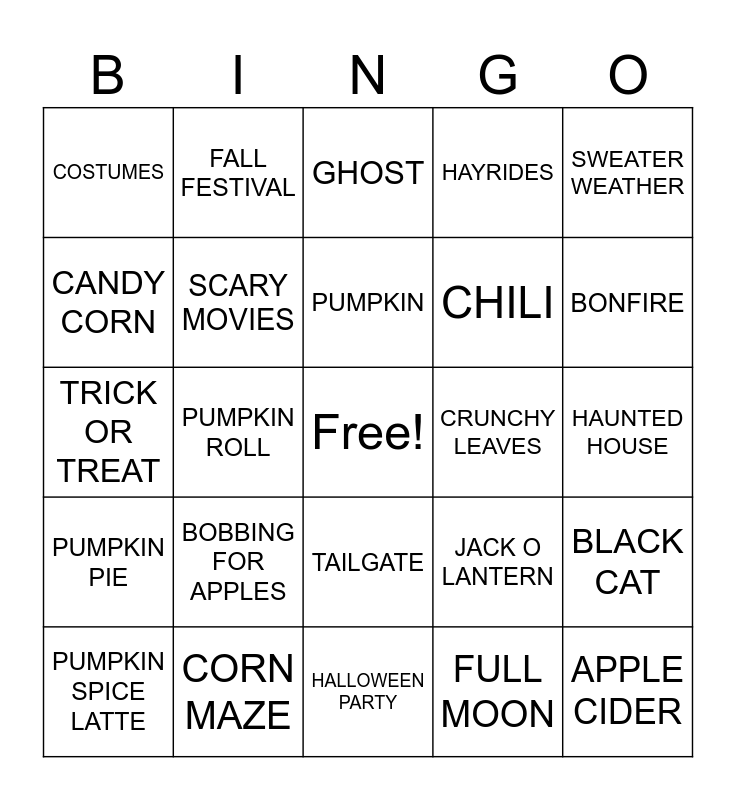 This bingo card has a free space and 25 words: BOBBING FOR APPLES, HALLOWEEN PARTY, PUMPKIN, PUMPKIN SPICE LATTE, SWEATER WEATHER, COSTUMES, CANDY CORN, FALL FESTIVAL, CRUNCHY LEAVES, TAILGATE, CHILI, TRICK OR TREAT, JACK O LANTERN, BLACK CAT, SCARY MOVIES, PUMPKIN CARVING, HAUNTED HOUSE, GHOST, BONFIRE, PUMPKIN ROLL, APPLE CIDER, CORN MAZE, PUMPKIN PIE, HAYRIDES and FULL MOON.