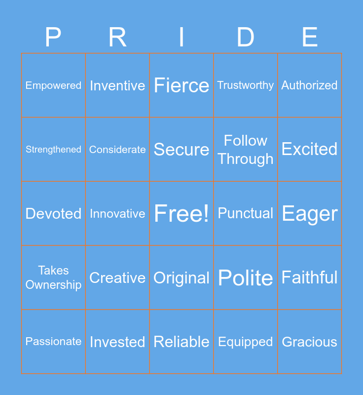 This bingo card has a free space and 29 words: Passionate, Respectful, Innovative, Dependable, Empowered, Fierce, Considerate, Creative, Punctual, Invested, Eager, Gracious, Reliable, Equipped, Excited, Humble, Original, Takes Ownership, Authorized, Devoted, Polite, Progressive, Follow Through, Strengthened, Trustworthy, Inventive, Faithful, Secure and Consistent.