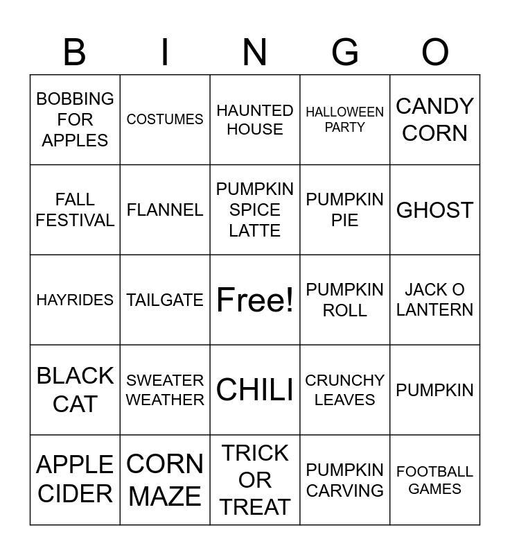 This bingo card has a free space and 25 words: SWEATER WEATHER, TRICK OR TREAT, PUMPKIN SPICE LATTE, APPLE CIDER, CANDY CORN, BOBBING FOR APPLES, FALL FESTIVAL, COSTUMES, PUMPKIN ROLL, CHILI, PUMPKIN PIE, HAYRIDES, CRUNCHY LEAVES, PUMPKIN, FLANNEL, FULL MOON, JACK O LANTERN, HAUNTED HOUSE, GHOST, TAILGATE, FOOTBALL GAMES, CORN MAZE, BLACK CAT, HALLOWEEN PARTY and PUMPKIN CARVING.