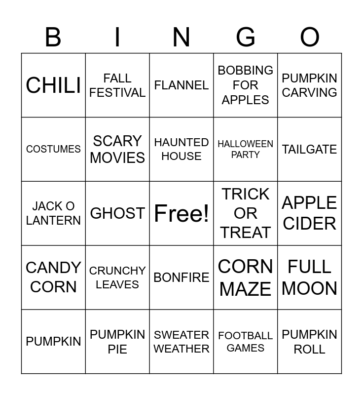 This bingo card has a free space and 25 words: CRUNCHY LEAVES, SWEATER WEATHER, HAUNTED HOUSE, PUMPKIN, PUMPKIN CARVING, CHILI, COSTUMES, FALL FESTIVAL, TRICK OR TREAT, BONFIRE, HALLOWEEN PARTY, JACK O LANTERN, CORN MAZE, FULL MOON, SCARY MOVIES, HAYRIDES, APPLE CIDER, FLANNEL, TAILGATE, GHOST, PUMPKIN ROLL, PUMPKIN PIE, CANDY CORN, BOBBING FOR APPLES and FOOTBALL GAMES.
