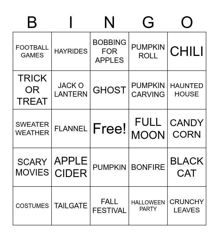 This bingo card has a free space and 25 words: APPLE CIDER, FALL FESTIVAL, GHOST, COSTUMES, CHILI, FOOTBALL GAMES, TRICK OR TREAT, HAYRIDES, FULL MOON, PUMPKIN, PUMPKIN CARVING, SWEATER WEATHER, BONFIRE, BLACK CAT, JACK O LANTERN, PUMPKIN SPICE LATTE, CANDY CORN, BOBBING FOR APPLES, HAUNTED HOUSE, FLANNEL, CRUNCHY LEAVES, TAILGATE, SCARY MOVIES, PUMPKIN ROLL and HALLOWEEN PARTY.