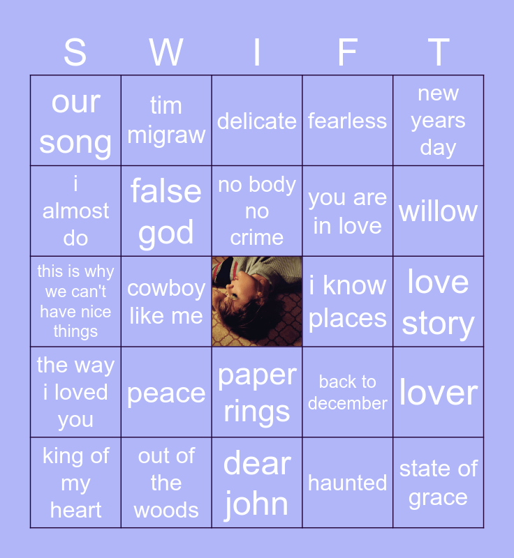 This bingo card has a free space and 54 words: picture to burn, the way i loved you, better than revenge, begin again, paper rings, should've said no, fearless, all too well, i almost do, don't blame me, our song, enchanted, out of the woods, king of my heart, hey stephen, dear john, state of grace, you are in love, i did something bad, love story, back to december, cardigan, i know places, new years day, our song, tim migraw, fifteen, white horse, mine, haunted, 22, the lucky one, how to get the girl, clean, delicate, end game, this is why we can't have nice things, lover, paper rings, false god, the archer, ME!, daylight, august, peace, betty, cardigan, mirrorball, no body no crime, cowboy like me, willow, tolerate it, champagne problems and closure.
