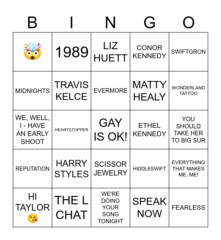 This bingo card has a free space and 44 words: JOE JONAS, FEARLESS, TAYLOR LAUTNER, HI TAYLOR 😘, JOHN MAYER, SPEAK NOW, LIZ HUETT, JAKE GYLLENHAAL, SWIFTGRON, THE L CHAT, CONOR KENNEDY, ETHEL KENNEDY, SCISSOR JEWELRY, HARRY STYLES, RED, WE'RE DOING YOUR SONG TONIGHT, KAYLOR, WE, WELL, I - HAVE AN EARLY SHOOT, I LIKE WOMEN AND PARTICULARLY GAY WOMEN, SO-, WONDERLAND TATTOO, 1989, KISSGATE, MY PUBLICIST WOULD KILL ME, 🤯, 💡, YOU SHOULD TAKE HER TO BIG SUR, CALVIN HARRIS, A BIG 'OL BEARD CAN ONLY TAKE YOU SO FAR, HIDDLESWIFT, REPUTATION, HAYLEY KIYOKO, EVERYTHING THAT MAKES ME, ME!, ME! OUT NOW!, YOU NEED TO CALM DOWN, HEARTSTOPPER, COWBOYS, HAIRPIN DROP, FOLKLORE, EVERMORE, MIDNIGHTS, MATTY HEALY, SEARCH ENGINE OPTIMIZATION, TRAVIS KELCE and DUSTY SPRINGFIELD.