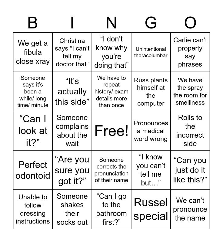 This bingo card has a free space and 24 words: “Are you sure you got it?”, Someone shakes their socks out, We have to repeat history/ exam details more than once, Unable to follow dressing instructions, Carlie can’t properly say phrases, We get a fibula close xray, Someone says it’s been a while/ long time/ minute, Christina says “I can’t tell my doctor that”, Pronounces a medical word wrong, Someone corrects the pronunciation of their name, Russ plants himself at the computer, “Can I look at it?”, “I know you can’t tell me but…”, “Can you just do it like this?”, “It’s actually this side”, Russel special, Rolls to the incorrect side, “I don’t know why you’re doing that”, We have the spray the room for smelliness, Someone complains about the wait, We can’t pronounce the name, Perfect odontoid, Unintentional thoracolumbar and “Can I go to the bathroom first?”.